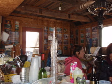 ほったて小屋に戻るとコンロからの白いモクモクも収まり料理ができそうだ。コンロとプロパンガスのヒーターで小屋もそこそこ暖まってる。