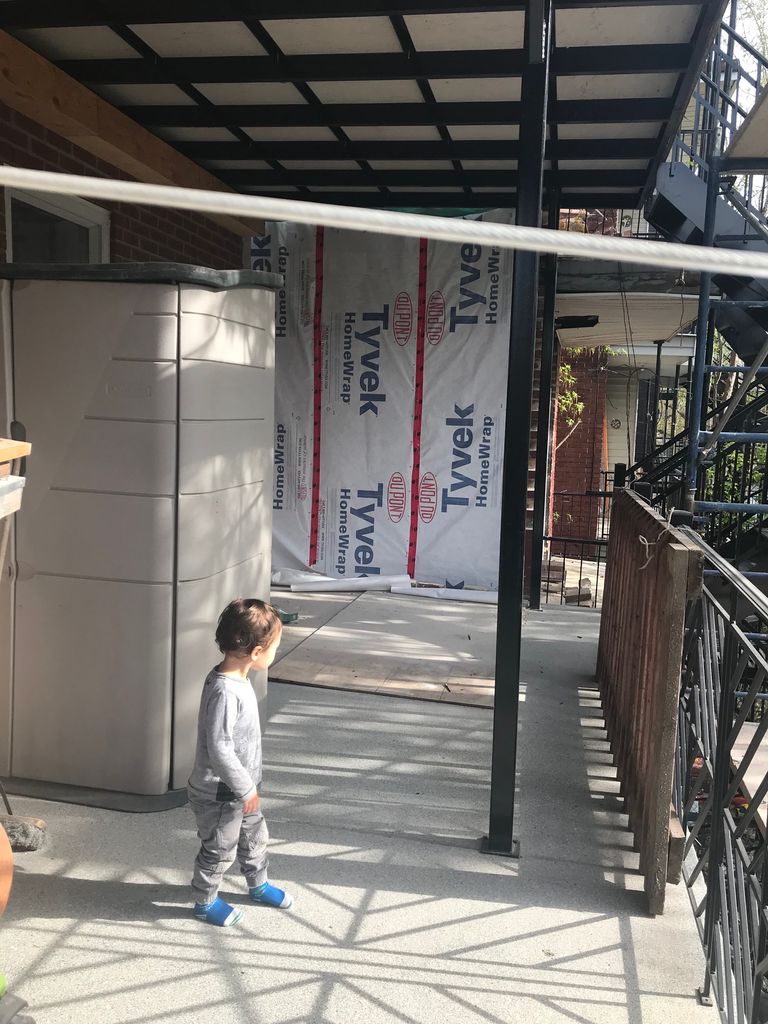 April 25, 2016 家の外壁工事スタート 4月12日(火)より、我が家は、大掛かりなリノベーションを始めました。以前(「家の外壁のリノベーション準備」日記参照)触れた、家の外壁の工事です。4月12日(火)外壁工事スタート。外壁の工事自体は、業者に任せているのですが、それに伴い、1階窓枠部分の修正や1階ロフトの内部のリノベーションもちょこちょこやったりと、JMも日々、仕事から帰ってきてからリノベーション作業をしており、お疲れ&忙しモード。工事準備の為に、業者の人達が階段の取り外しをしている所を興味深げに眺める子ども達。幸い、今回は、家の中にまで埃が舞うと言う事はないので、私は、安全なのだが、外壁工事と言う事で、窓の外には、ビニールシートが外側から被せられ、やっとお天気の良い春の日差しが入って来る季節になったのに、朝、カーテンを開けても見えて来る景色は、ビニールシートの埃っぽいグレーのみ。。。お家の玄関を開けると正に工事現場に!工事の為、2階に上がる階段も取り外され、上の写真の様な工事用の足場が設置されたので、我々住人は表の玄関からの出入りが不可能になり、ただ今、裏口のみを使用中。寝室の窓からの眺め、ビニールシートで何も見えない。。。今年は、私の出産もあるし、JMも学生に戻るので、無駄遣いも出来ず、大きなリノベーションは、これで終了する予定。「4月27日の水曜には、工事は終わる。」との事だが、私の予想では、金曜だな。それにしても、先日、日本の家族から「荷物を送ったが、そろそろ届いたか?」と連絡が来た。そーいえば、工事をはじめてから、手紙等を回収してない。と言うか、表玄関を開けないから郵便受けもチェックしてないし、そもそも階段の使用ができないので、郵便配達の人も不在届けすら残せないだろう(裏まで配達してくれるとは思えん)、、、郵便物はいづこへぇーーーーー?!郵便局に確認してみねば。。。